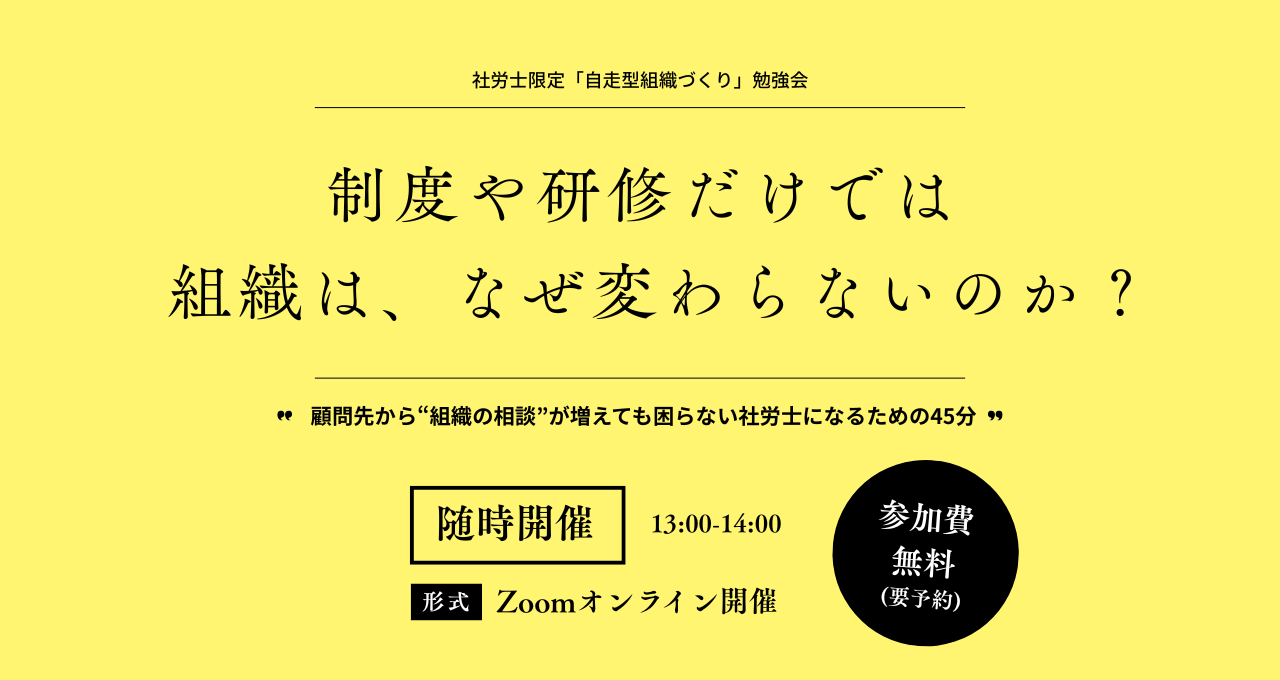 詳細をみる【社労士限定/無料オンライン勉強会】制度や研修だけでは、なぜ組織は変わらないのか?ー顧問先から“組織の相談”が増えても困らない社労士になるための45分ー