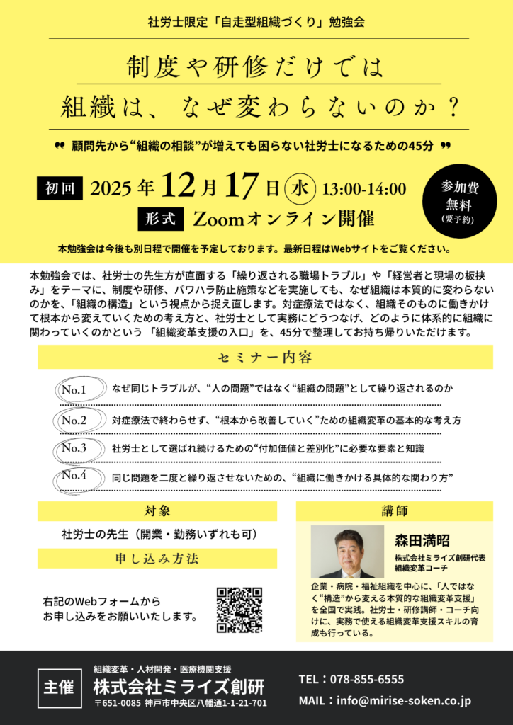 本勉強会では、社労士の先生方が日常的に直面する「何度も繰り返される職場トラブル」や「経営者と現場との板挟み」という課題をテーマに、なぜそれらの問題が“人の問題”として処理され続け、結果として再発を繰り返してしまうのかを、「組織の構造」という視点から本質的に読み解いていきます。制度や単発研修といった対症療法ではなく、組織そのものの在り方に目を向けることで、はじめて見えてくる“根本から状況を変えていくための考え方”と、社労士として実務にどうつなげ、どのように体系立てて組織に関わっていくのかという「組織変革支援の入口」を、45分でわかりやすく整理してお持ち帰りいただける勉強会です。