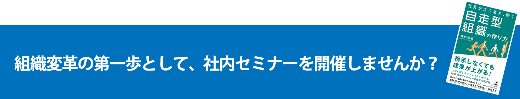 「社員が自ら考え動く 自走型組織の作り方」(書籍)新書ランキング1位を獲得。数多くの中小企業の組織変革をサポートした経験を事例とともにまとめた一冊。自走型組織へと改革するための方法をわかりやすく解説しました。幻冬舎より発売中です。